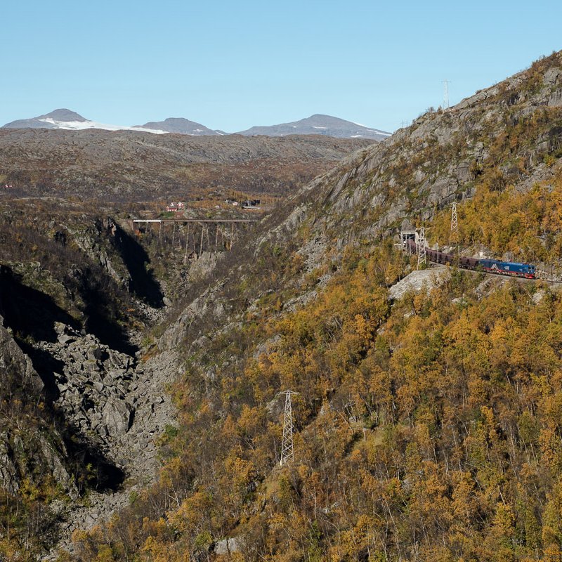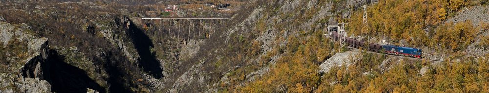 LKAB IORE 131 "Straumsnes" + 123 "Riksgränsen"  mit mgt 9912 im Norddalen. Links die alte, seit 1988 unbenutzte Norddalsbrua.