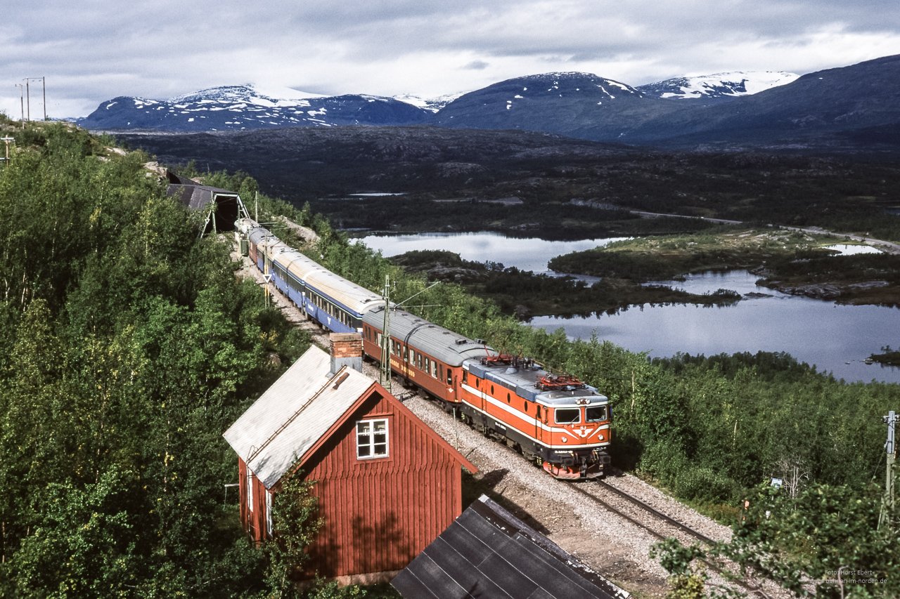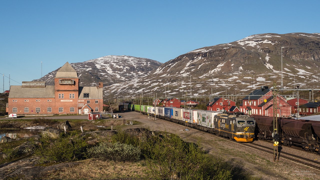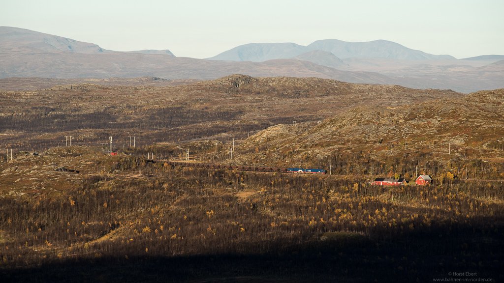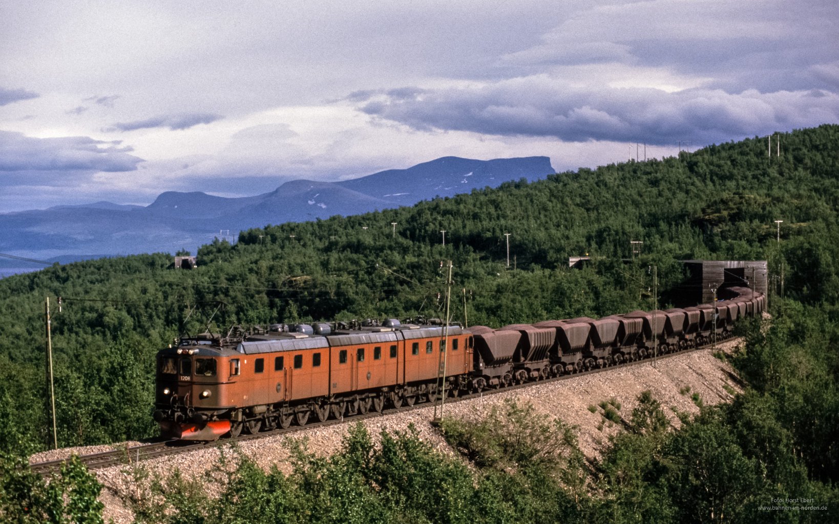 Dreiteilig waren diese Loks jedoch weiter auf der Erzbahn in Lappland zu den Häfen Luleå und Narvik im Einsatz. Hier, bei Tornehamn, gab es einst eine Barackensiedlung der Bahnbauarbeiter, der rallare; den Friedhof der dort an Typhus Verstorbenen kann man noch heute besuchen.  SJ Dm3 1208+1233+1207.