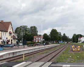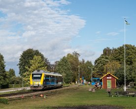Västtrafik Itino Y31 1417 als Rst 3304 Göteborg - Mariestad in Lugnås an der Kinnekullebanan. Der "Plåtstins" signalisiert den Haltewunsch der Wartenden, und rechts wird an die Schmalspur-Ära auf 891mm in Västergötland erinnert.