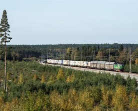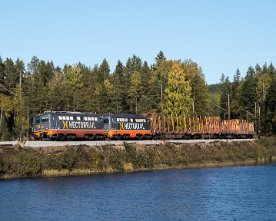 RushRail 185 413 "Grumpy" bei Sellnäs mit Holzzug 69214 von Hällefors nach Borlänge