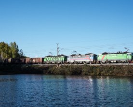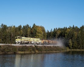 Infranord DLL 3107C + 3106E (gebaut als Baureihe Tb für die SJ) mit Schotterzug am See Uvsjön zwischen Kälvattnet und Skorped