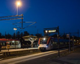 Västtrafik X61 61401 von Göteborg fährt in den Pendeltåg-Endpunkt Alingsås ein, hinten X11 3144 übers Wochenende abgestellt. Das Gleis für die Pendeltåg soll nun von der Seite zwischen die durchgehenden Gleise verlegt werden.